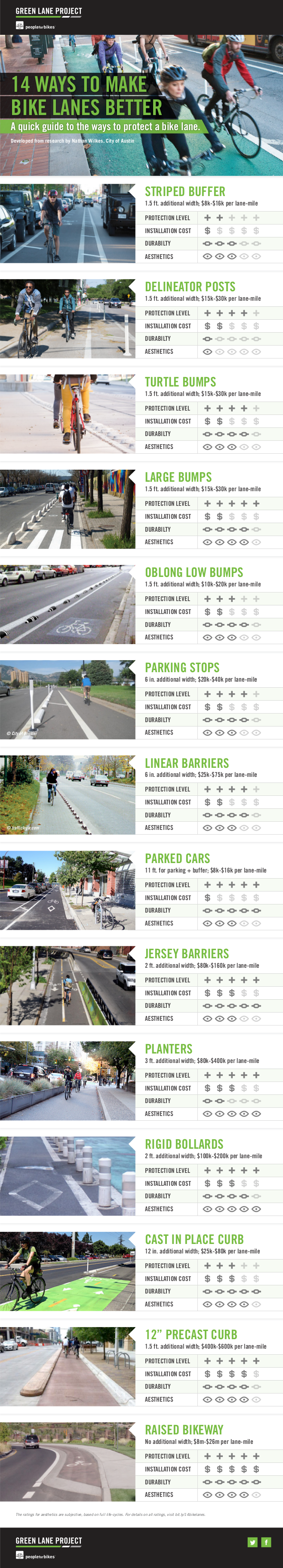 With so many different methods being used to physically separate bike and auto traffic, the tradeoffs can seem countless. That’s where this infographic comes in. One part inspiration and two parts catalog, it’s intended for anyone who wants to quickly get up to speed on the most popular tricks being used by cities around the world to improve bike lanes.