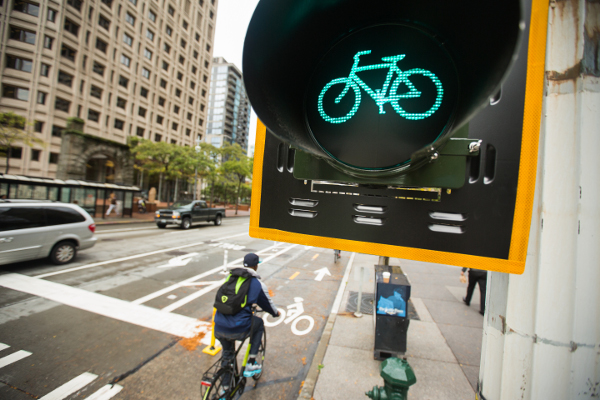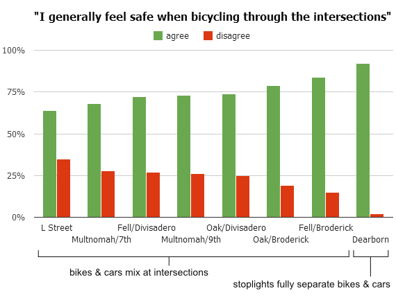 As the chart above shows, most people biking tend to feel safe in both situations, but the most sensitive riders — the ones that protected bike lanes are supposed to appeal to in the first place — strongly prefer signalized separation as seen on Chicago’s Dearborn Street, Seattle’s 2nd Avenue or the Indianapolis Cultural Trail. (It’s no coincidence that these three all ranked in the top two slots of our “best new bike lanes” lists in 2013 and 2014.)